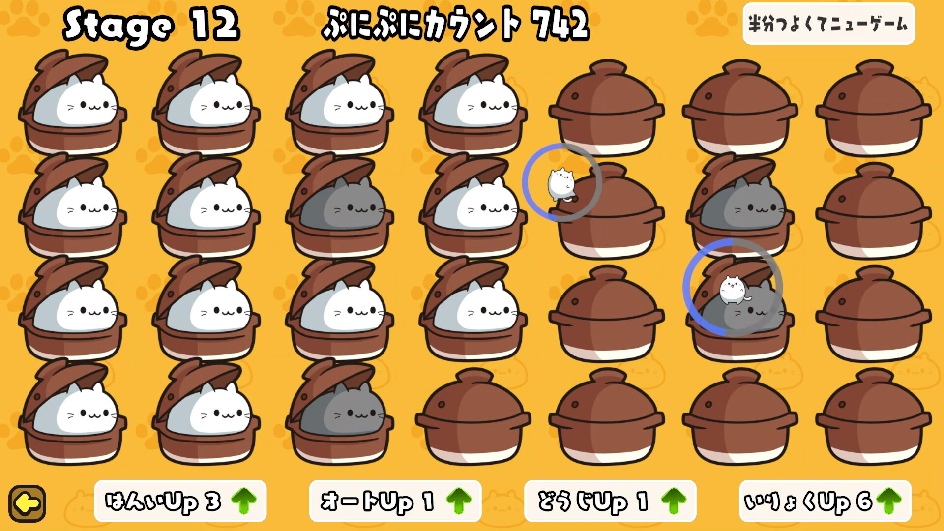 ステージクリアでステータスアップが可能に、クリック範囲や同時クリック数などを強化できます。