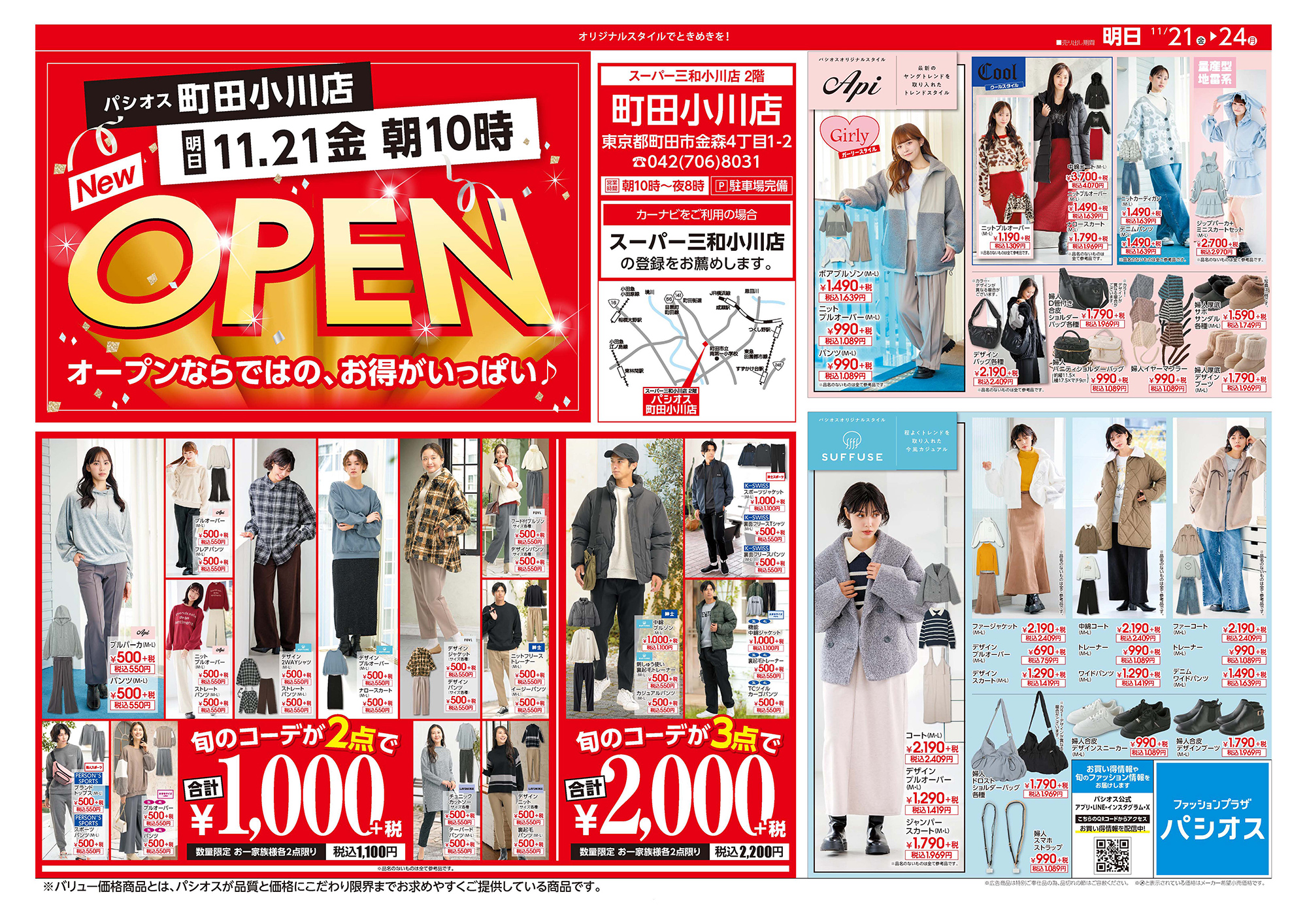 「パシオス 町田小川店」は、東京都町田市の都道141号線(町田街道)沿いに立地する「スーパー三和小川店」2階に、11月21日(金)オープンいたします。