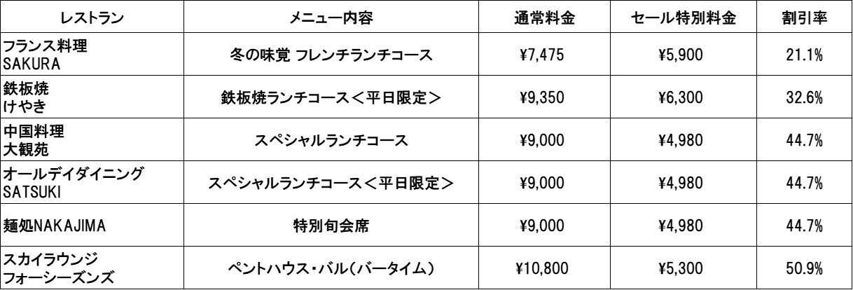 『 ブラックフライデー&サイバーマンデーセール 』では、多彩なレストランでの美食もお愉しみいただけます。ホテル最上階からの絶景を眺めながらシェフが厳選したお肉を目の前で焼き上げる鉄板焼、ソムリエ厳選のワインと旬の食材を生かした創造性あふれる美食が味わえるフランス料理など、全6店舗のレストランが誇る人気メニューを最大50%割引で堪能できる限定セールを開催します。