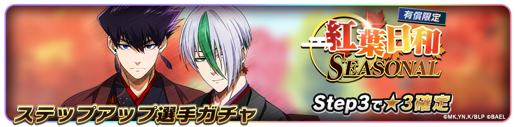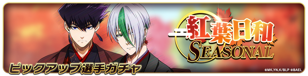「<紅葉日和>ステップアップ選手ガチャ」に、【★3[紅葉日和]烏 旅人】と【★[紅葉日和]乙夜 影汰】が期間限定でピックアップされます。