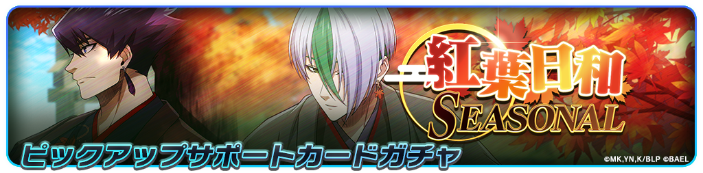 今回新登場となった【SSR[紅葉の余白にひと息]烏 旅人】と【SSR[紅葉の縁にて]乙夜 影汰】がピックアップ対象として登場する、「<紅葉日和>サポートカードガチャ」を開催します。