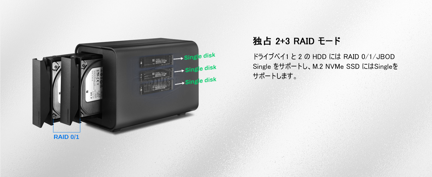 HDD/SSD(トレイ1・2):RAID 0/1、JBOD、Single