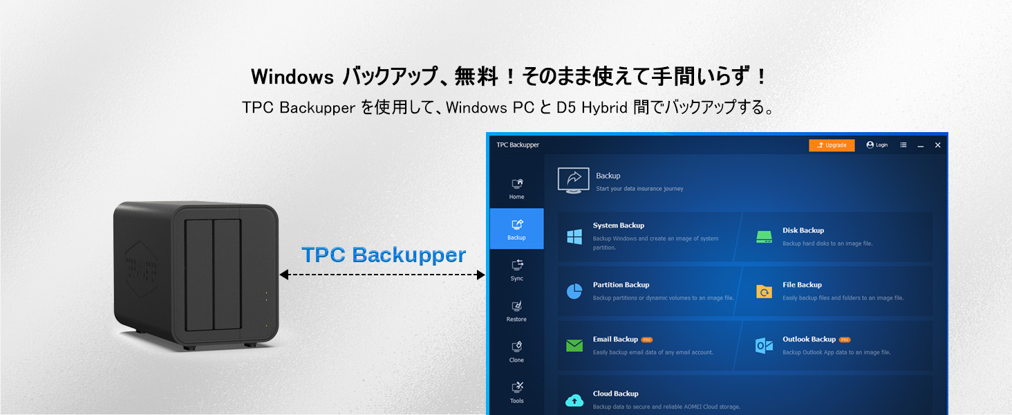 無料バックアップツール「TPC Backupper」を利用すれば、Windows PCのスケジュールバックアップを手軽に設定できます。TerraMasterのUSB接続HDDストレージやNASサーバーに対し、フォルダーやディスクパーティションのバックアップを自動化でき、接続してインストールするだけで、すぐにバックアップ環境を構築できます。また、増分バックアップと差分バックアップの両方式に対応し、Windows 8/8.1/10/11でご利用いただけます。