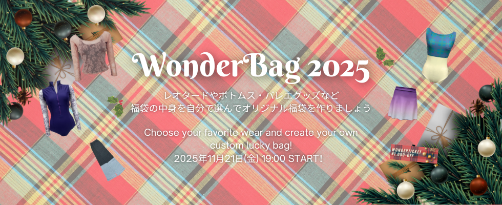 たくさんの商品の中から好きなアイテムを選び、自分だけのオリジナル福袋を作ることができる、冬だけの特別企画です。「好みに合わないデザインの商品やサイズが合わない商品が入っていたらどうしよう」という心配がなく、お気に入りのアイテムだけを詰め込んでいただける特別感のある福袋となっています。さらに各コースには、次回以降ご使用いただける「ワンダーチケット」が特典として付いており、消耗品も多いバレエのレッスンを継続的に楽しんでいただける工夫の凝らした企画・フェアです。