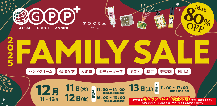 「美しくあること、健やかであること」をテーマに、アロマ・バス・ボディケアアイテムを展開する株式会社グローバルプロダクトプランニング(以下GPP/本社:東京都渋谷区南平台町)は、12月11日(木)~13日(土)の3日間、渋谷本社にて「GPPファミリーセール」を開催します。