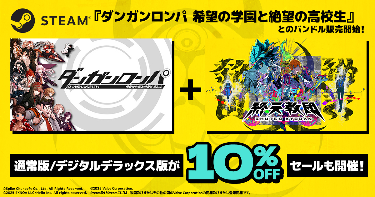 ハイスピード推理アクション『ダンガンロンパ 希望の学園と絶望の高校生』と、『終天教団』がセットになったバンドルをSteam®にて販売中です。バンドルは通常価格より10%オフでご購入いただけるため、大変お得となっています!
