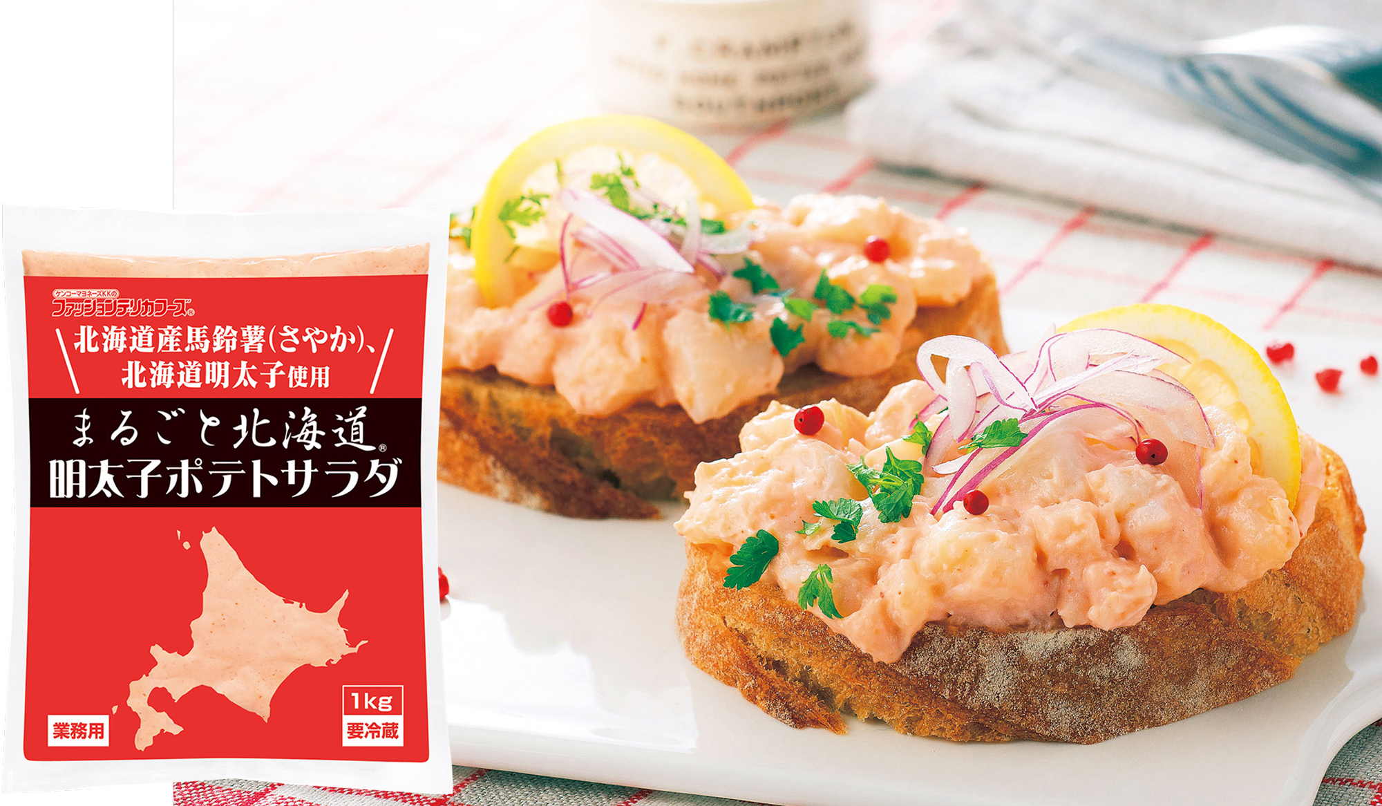 北海道明太子と北海道産ばれいしょを使用した海と大地の絶品コラボレーションです。強い旨味とまろやかな辛味の明太子が、サラダはもちろんホットメニューでも程良いアクセントになります。焼いてもきれいな色合いです。