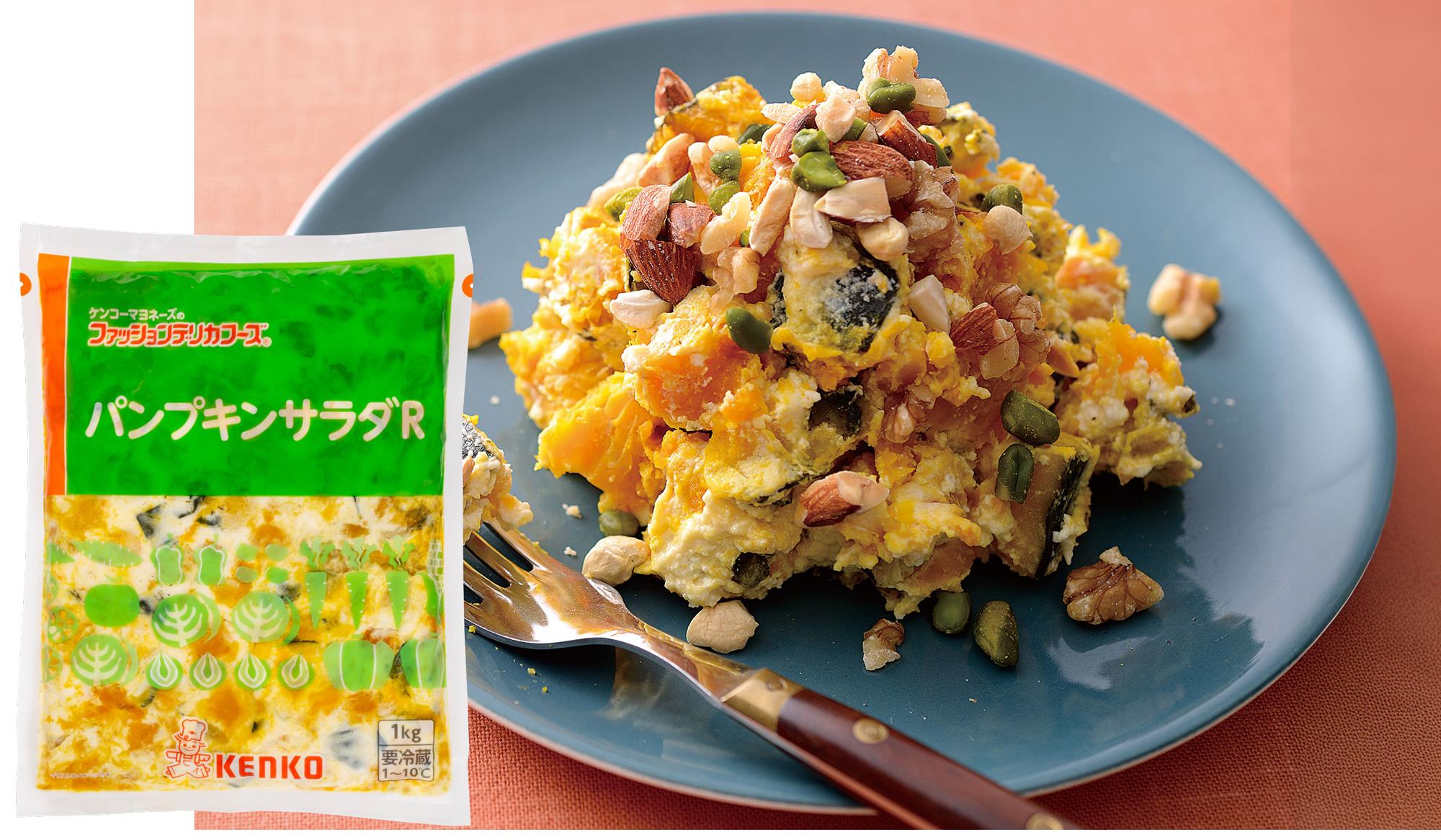 ゴロゴロとしたかぼちゃをクリーミーな専用ソースで合わせました。食べ応えがあり、甘味のあるかぼちゃが幅広い層に人気のサラダです。
