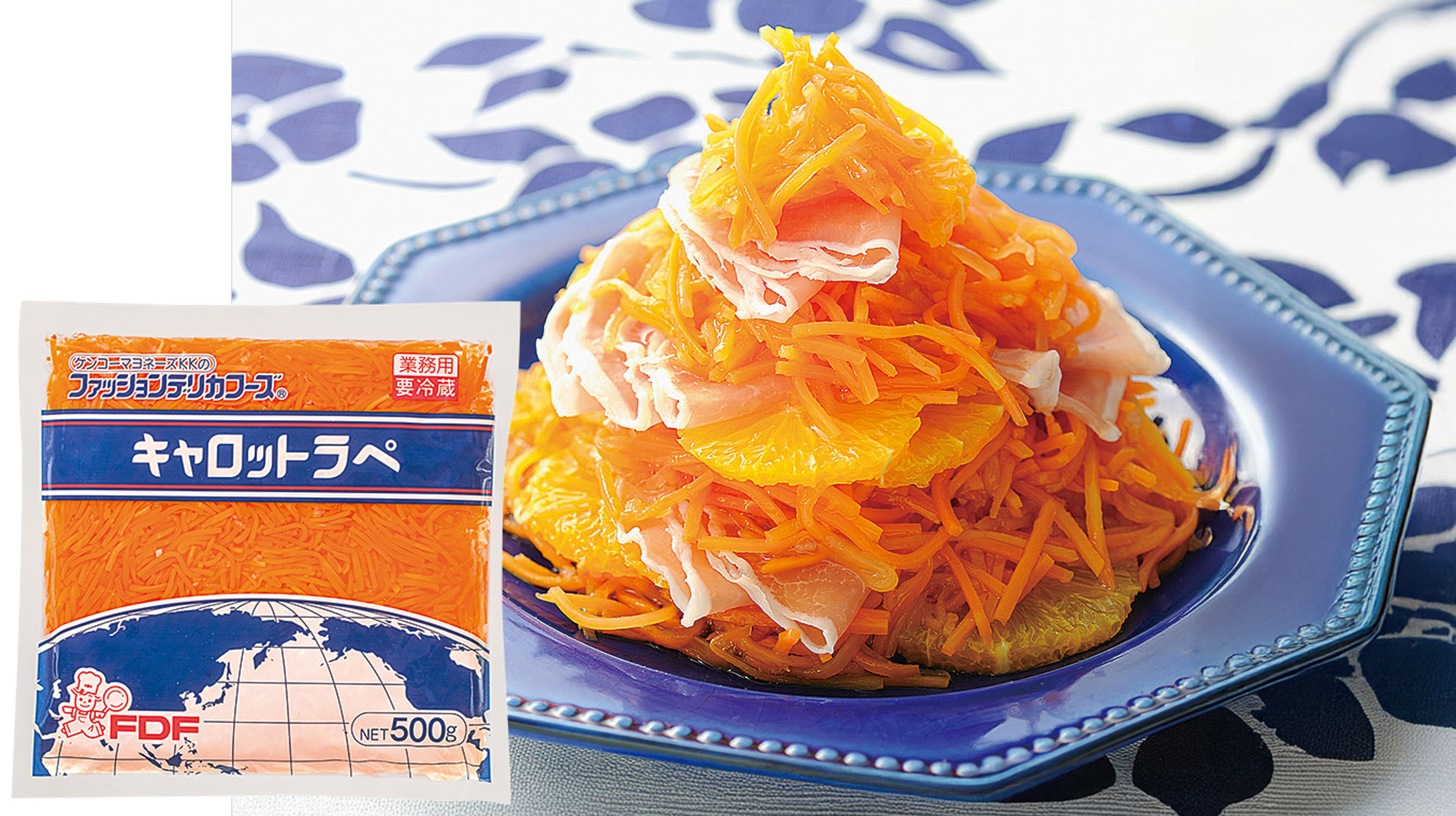 鮮やかなオレンジ色に心惹かれる「キャロットラペ」は、細切りにしたにんじんをフレンチドレッシングに漬け込むフランスの代表的な定番サラダで、お総菜屋さん、ビストロ、家庭でもよく食べられています。レモンピールをきかせ爽やかな味わいに仕上げました。