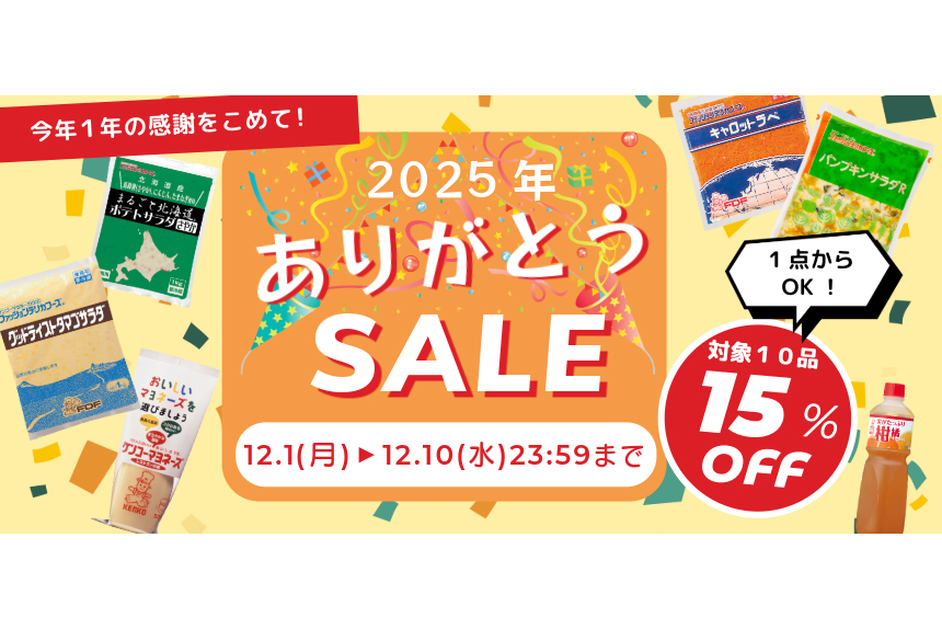 ケンコーマヨネーズ株式会社は、本日から、当社公式通販サイトにおいて「2025年ありがとうSALE」を開始します。12月10日(水)までの限定で、対象商品10品が15%OFFになります。
