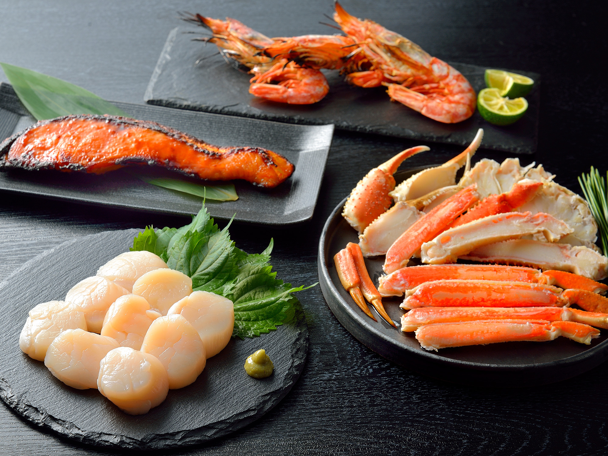 ボイルずわいがにハーフポーション(肩肉入り) 450g、刺身用ほたて貝柱150g、銀鮭西京風味噌漬 約120g×3切、冷凍赤えび(刺身用)5尾