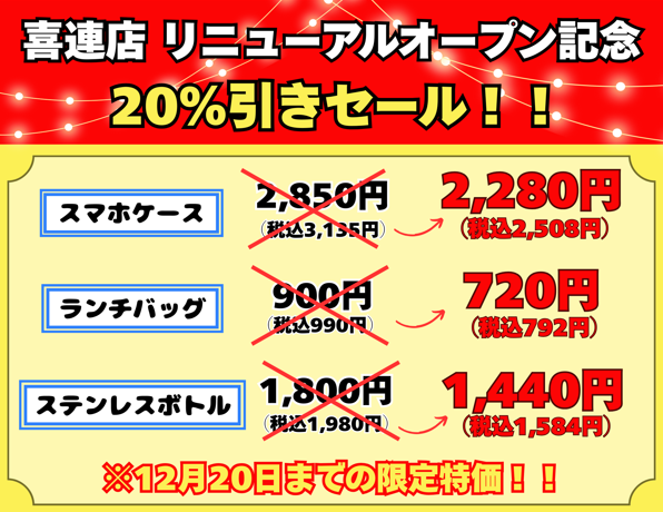 リニューアルオープン記念セールとして12月6日~12月20日まで対象商品を20%引きで販売いたします。