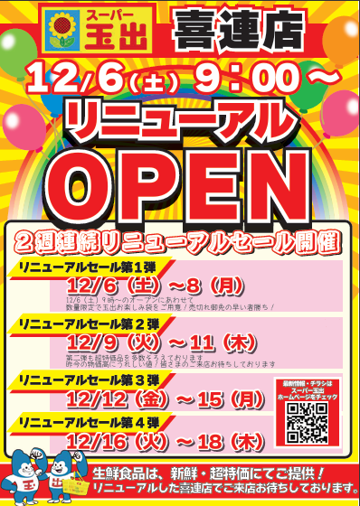 株式会社フライフィッシュが運営するスーパー玉出(本社:大阪市西成区)は、2025年12月6日(土) 朝9時より「スーパー玉出 喜連店」(大阪府大阪市)をリニューアルオープンいたします。