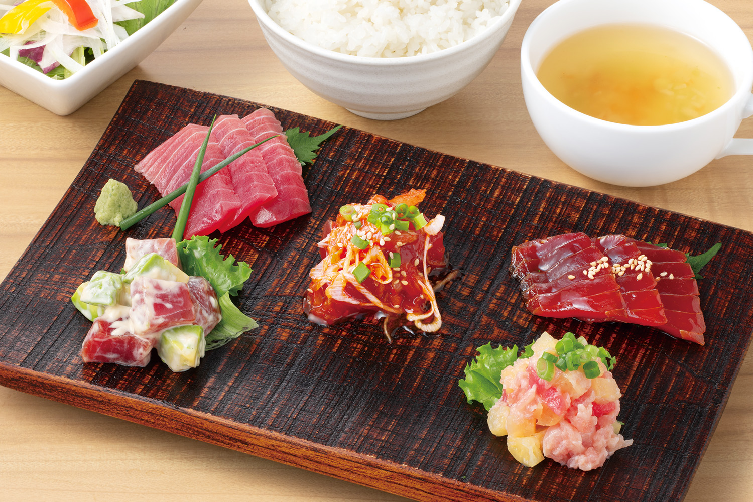 ランチタイムも、マグロを心ゆくまで味わえるラインナップ。特に「OH!!TORO!!定食(1580円)」は、「本マグロ 中トロ」や「漬けマグロ」、「マグロキムチ」、「マグロアボカド」、「トロたく」の5つが贅沢に楽しめます。この他、「上鉄火丼(1400円)」や「マグロユッケボウル(1200円)」など、バラエティ豊かなマグロ尽くしのメニュー全8種類を楽しめます。