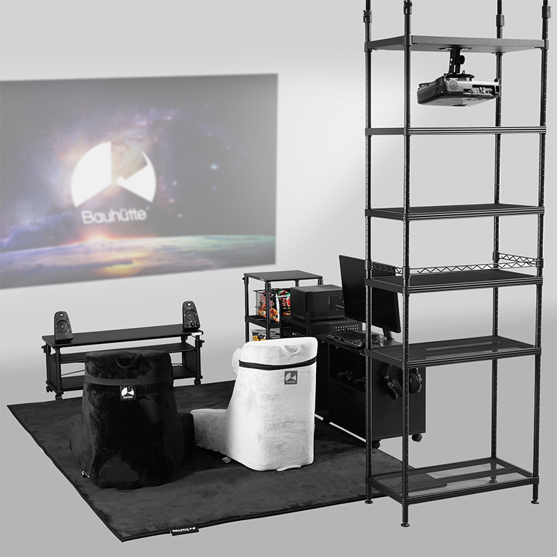 部屋を100インチ超えの大画面シアターに魔改造するレイアウトを新たに考案。プロジェクターを天吊りラックで空間を邪魔せずスマートに設置し、テレビ台やスピーカースタンドの高さも自由に調節することで、大迫力の映像とサウンドを最適なポジションで楽しめるのが特長です。ソファや着る毛布にくるまりながら、ふかふかのラグの上でぬくぬくとゲームに没頭可能。ゲーム機やデバイスの収納にも配慮し、ごちゃつきがちな配線や機材を隠しつつ、必要な時にすぐにアクセスできる機能性を両立させた、究極の「おこもりシアター」環境です。
