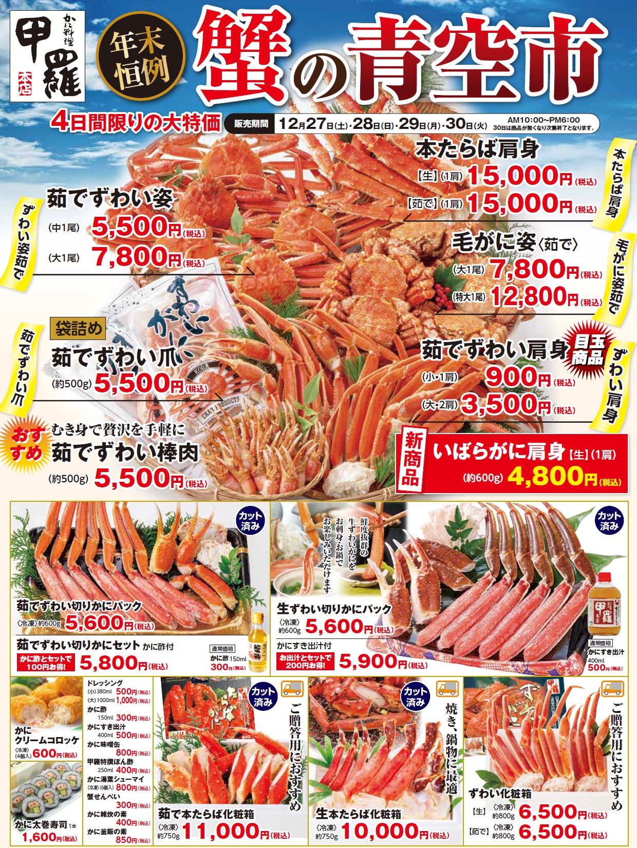 かに料理専門店「甲羅本店」が年末にお届けする人気ベント「蟹の青空市」。今年も店舗で特設売場を設置し、4日間限定(関東エリアは3日間)で開催いたします。創業から50年以上の歴史をもつ「甲羅本店」が独自ルートで仕入れた、厳選の本たらば蟹やずわい蟹、毛がになど肉厚で濃厚な味わいの蟹を日頃のご愛顧に感謝して特別価格にて提供します。
