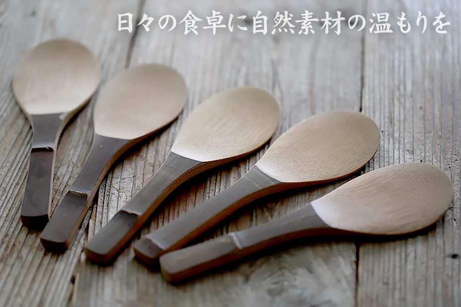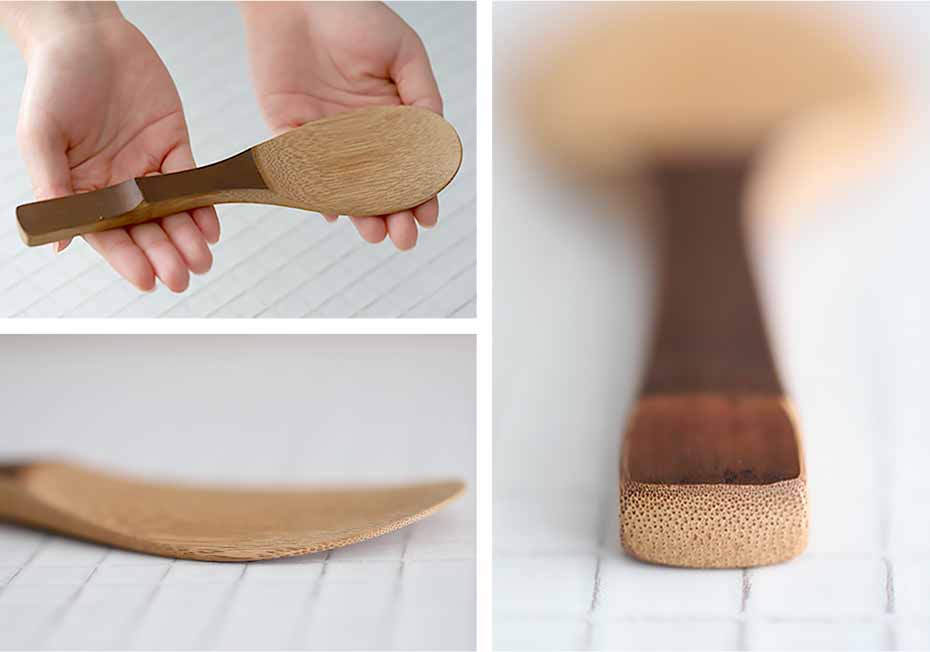また、竹の特性である軽さとしなやかさを活かしつつ、強度を損なわない絶妙な厚みに仕上げており、ご飯をふんわりとやさしくすくえる使い心地にも定評があります。節の位置には個体差がありますが、それも天然素材ならではの魅力。一つひとつに異なる表情があり、手に取るたびにあたたかみを感じていただけます。