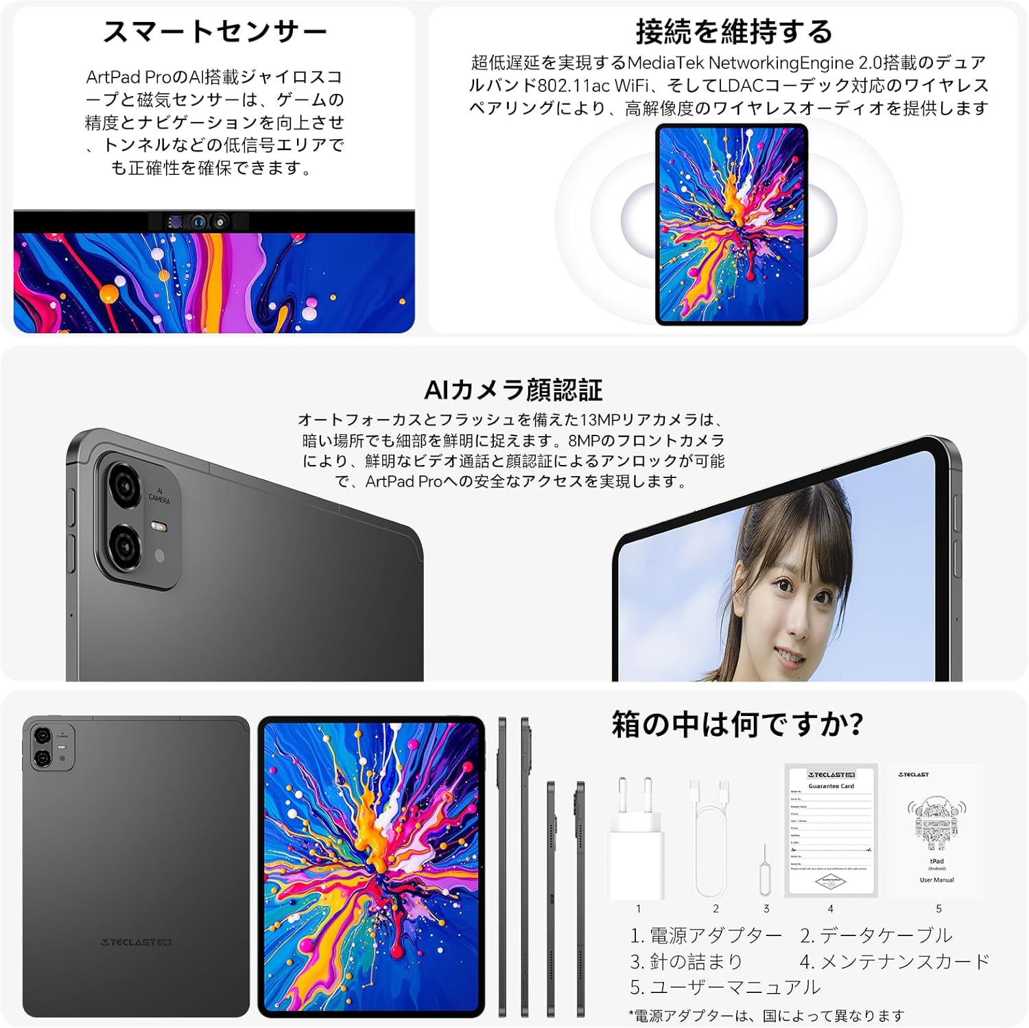 【Art OS 生産性進化 Android 15 タブレット、20GB+256GB+1TB拡張 超大容量、8MP/13MPカメラ、Smartボタン+Gemini AI 】ArtPad Pro タブレットは8GB LPDDR4 RAM+12GB仮想拡張メモリで合計20GBメモリ環境を構築。256GB UFSストレージをTFカードで1TBまで拡張可能。