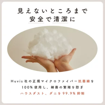 枕の中綿にはHuvis社製のマイクロファイバー抗菌綿を100%使用