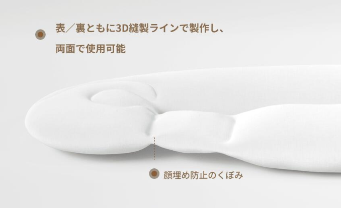何よりも赤ちゃんの安全を最優先し、裏/表ともに首の曲がりを防ぐライン、頭部の圧力を分散するライン、顔埋め防止のくぼみラインという3つの3D縫製ラインを入れて設計。