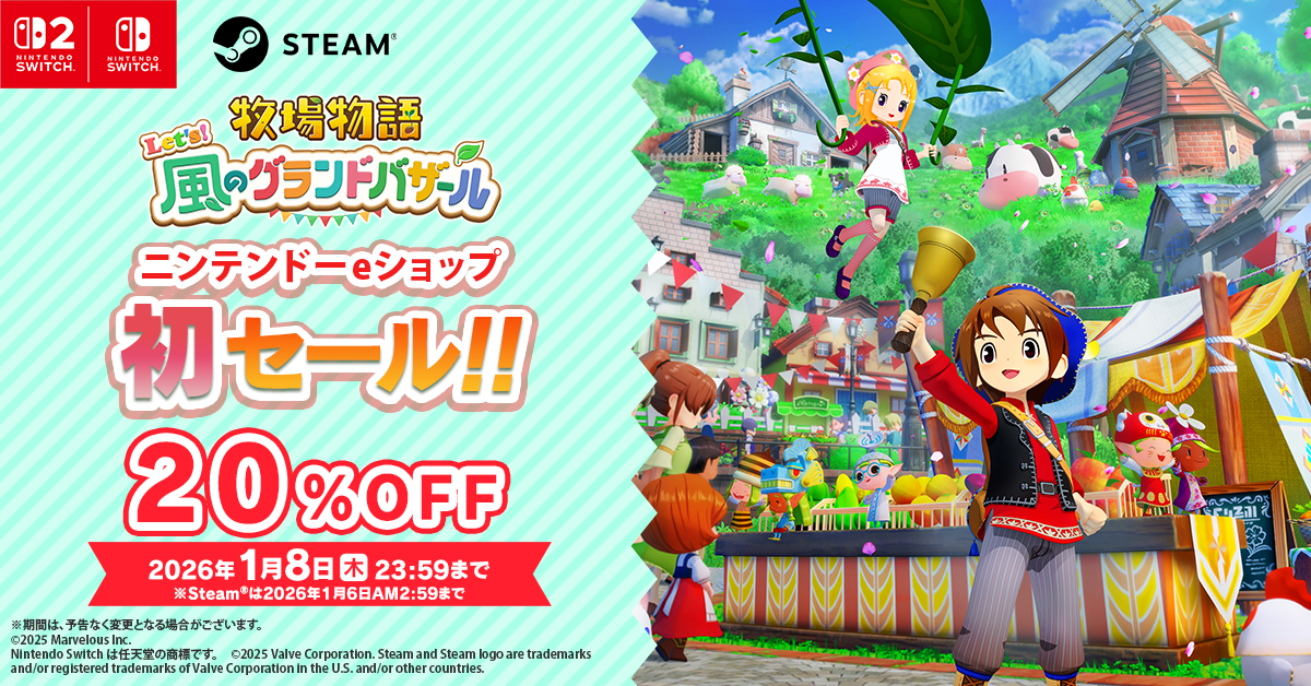 株式会社マーベラスは、「牧場物語」シリーズ最新作ほのぼの生活ゲーム『牧場物語 Let’s!風のグランドバザール』Nintendo Switch™版とNintendo Switch 2 Edition の初セールを開催したことをお知らせいたします。