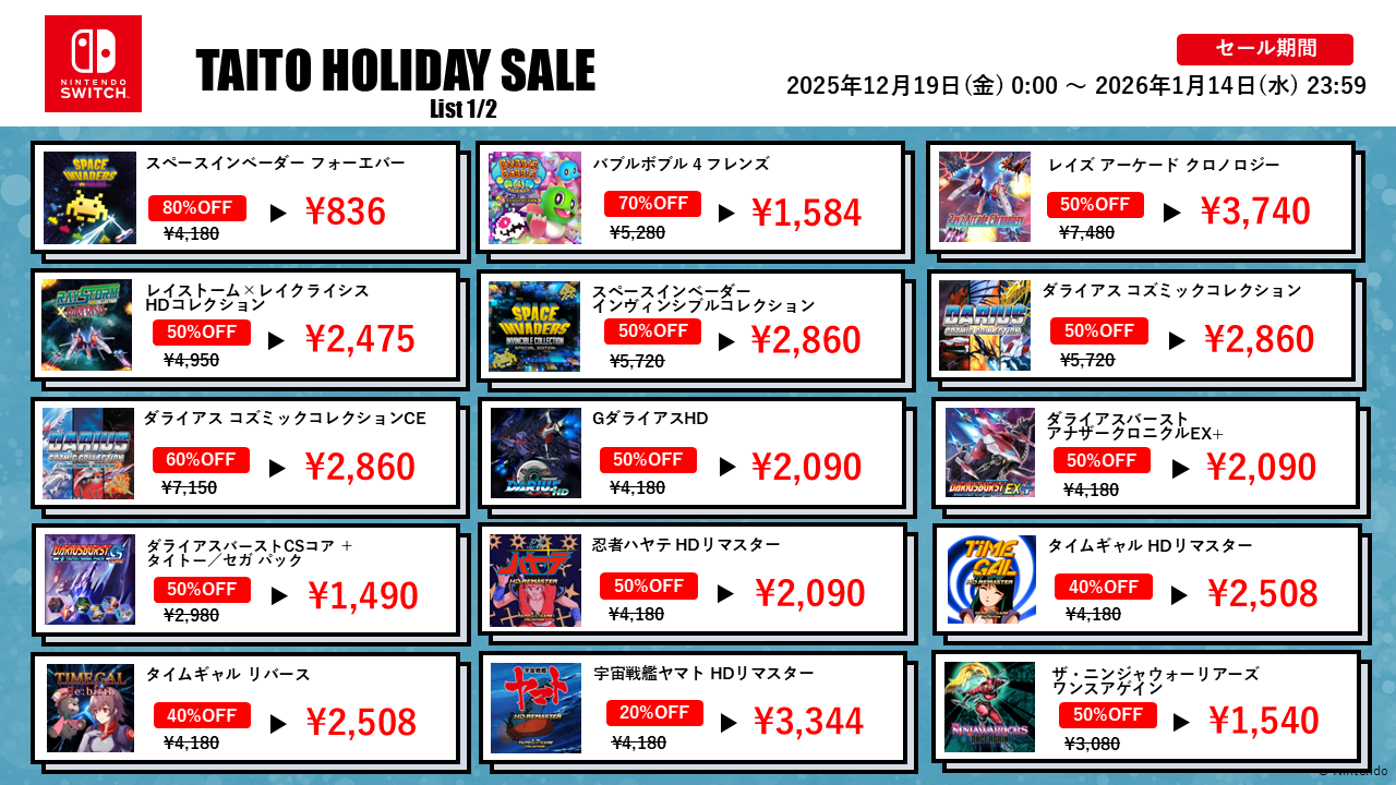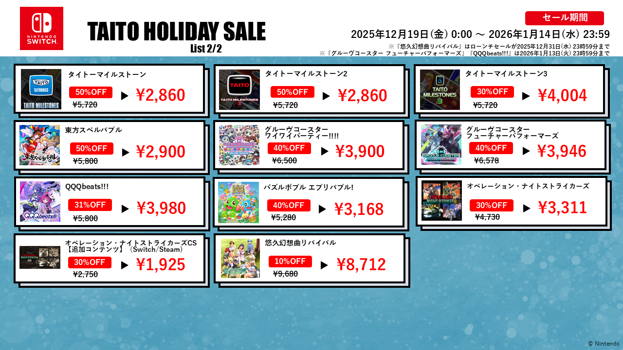 株式会社タイトー(本社:東京都新宿区、以下タイトー)は、対象のNintendo Switch™用ソフト(ダウンロード版)やSteam用ソフトが最大80%オフとなる「タイトーホリデーセール2025」を実施いたします。