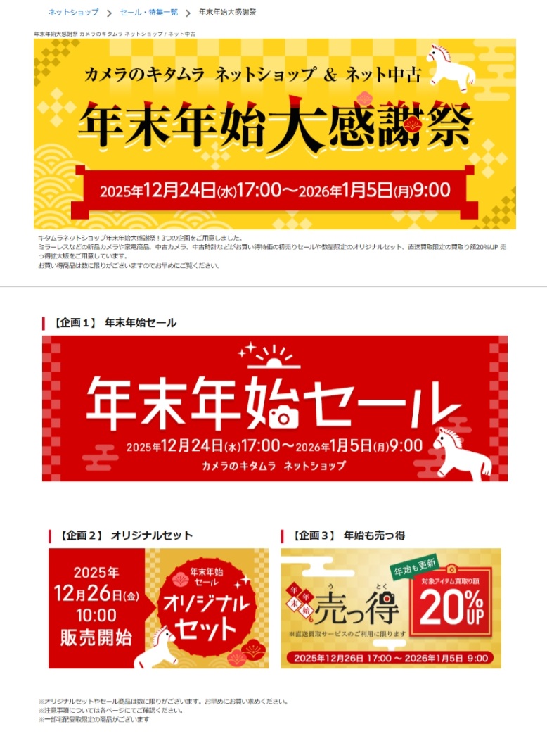 株式会社カメラのキタムラ(代表取締役社長執行役員:山﨑 智彦)は、自社運営サイト「キタムラネットショップ」と「キタムラネット中古」にて2025年12月24日(水)17:00~2026年1月5日(月)9:00までの期間限定で、年末年始大感謝祭を開催いたします。