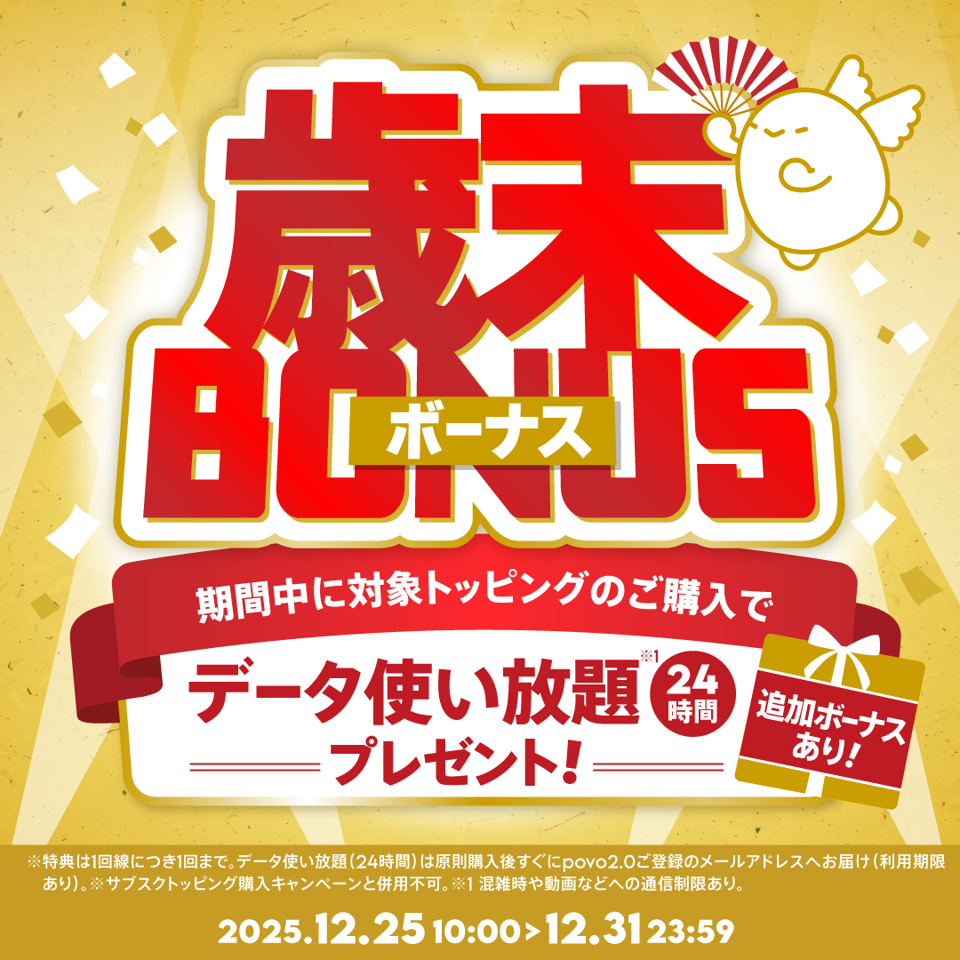 KDDI、沖縄セルラーは2025年12月25日から、povoの「歳末祭」を開催します。povoは、年末・年始で2つのキャンペーンを予定しており、今回は第1弾となる年末のキャンペーンです。