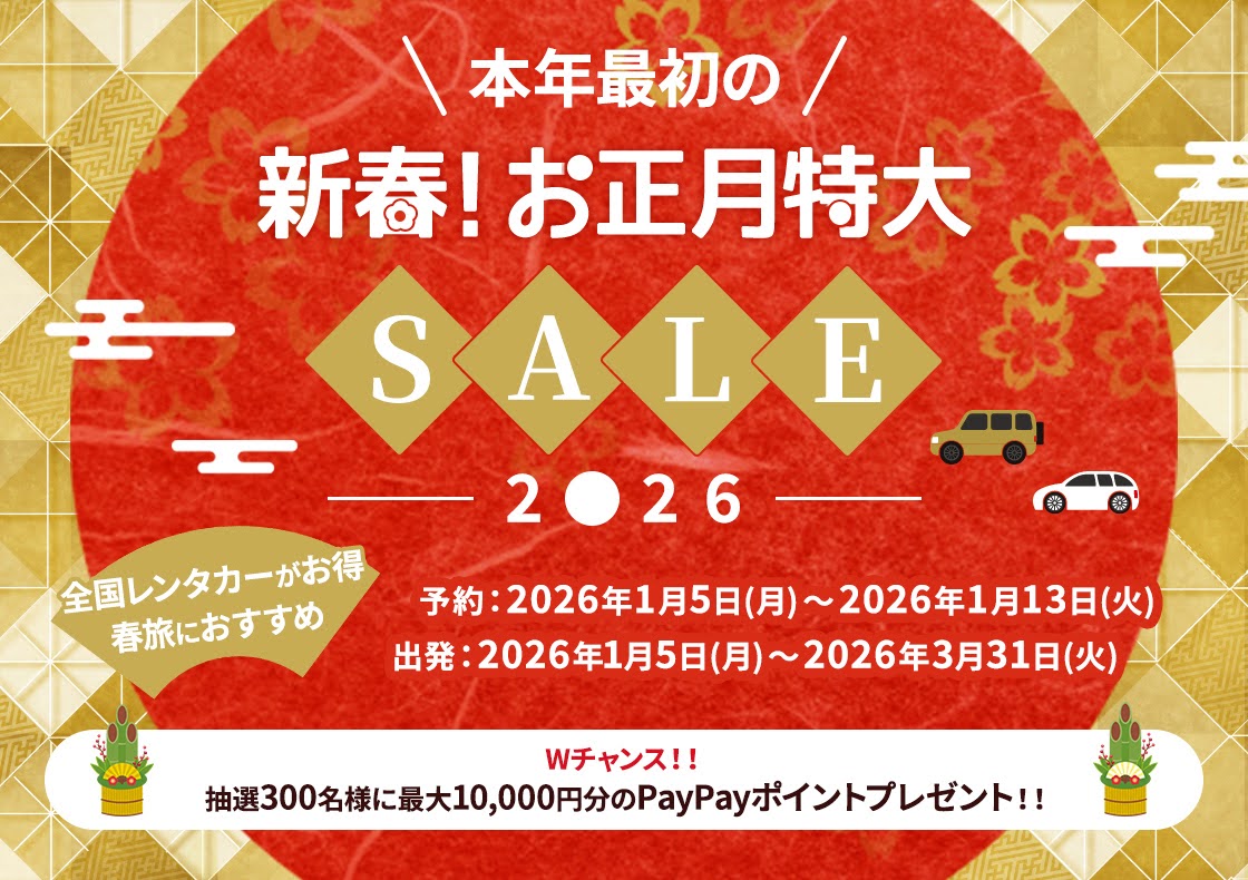 「新春!お正月特大SALE2026」の開催期間中のご予約で、最大1万円OFFになります。各レンタカー会社から、人気のコンパクトカーや、これからの季節に最適なスタッドレスタイヤ付きレンタカーがお得になるプランなどがセール価格でご予約いただけます。