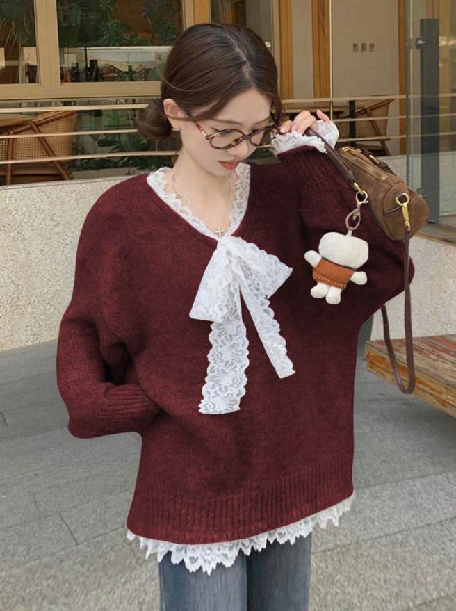 商品名:ルーズVネック レースパッチワーク リボンニットセーター