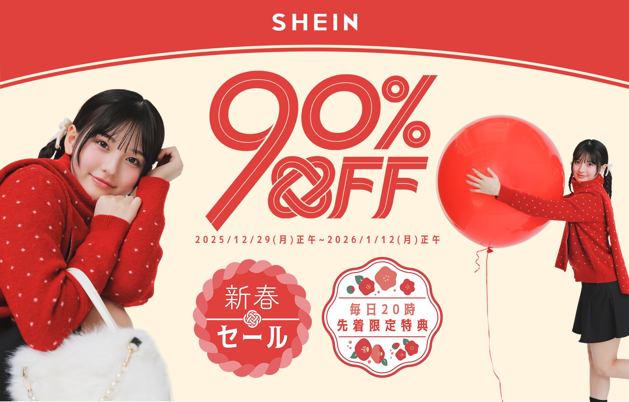 この度SHEINは、みなさまに新年一発目のお買い物をお楽しみいただけるよう、2025年12月29日(月)12:00から2026年1月12日(月)12:00までの期間で、トレンドファッションアイテムや生活雑貨など、全カテゴリの対象商品が最大90オフでお買い求めいただける2026年初のビッグセール『#SHEIN新春SALE』を開催いたします。