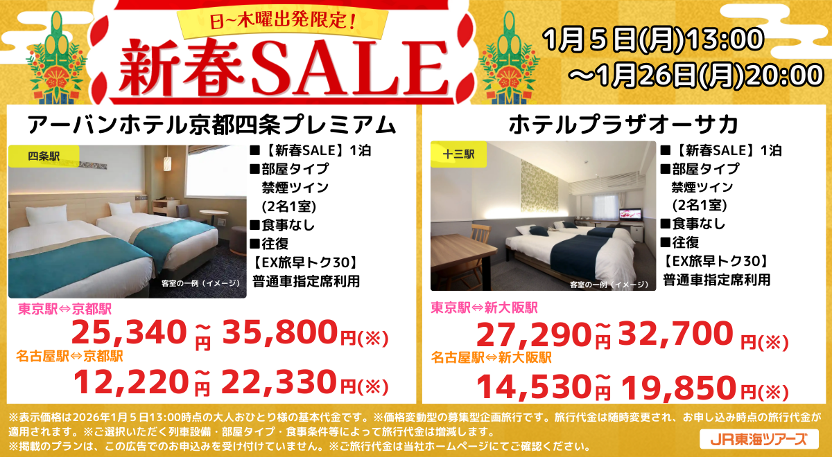 株式会社ジェイアール東海ツアーズ(本社:東京都中央区、以下JR東海ツアーズ)は、2026年1月5日(月)13:00より「日~木曜出発限定!新春SALE」を開催いたします。