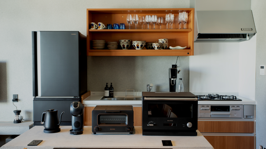 ④電化製品・アメニティまで細部にこだわり!沖縄らしい素朴な味わいの琉球風グラス・やちむんの食器のほか、高性能でデザイン性の高い「バルミューダ」家電をご用意しております。