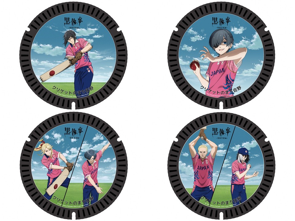 クリケット発祥の国であるイギリスが舞台のTVアニメ「黒執事 -寄宿学校編-」の劇中でクリケット大会が描かれたことが縁となり誕生した、佐野市とのコラボマンホール(※1)のデザインに加えて、今回、新たに完成したデザインパネルを初めて一般公開。10月に披露された4種を含めた全5種のイラストのパネルをご覧いただけます。