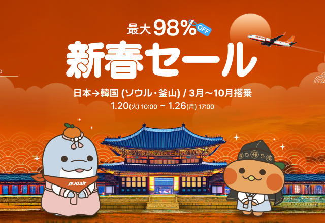 チェジュ航空(代表取締役社長:キム・イベ、Kim E-bae)は、1月26日(木)17時まで、日本発韓国行き航空券を片道運賃700円から販売する「2026新春セール」を実施する。