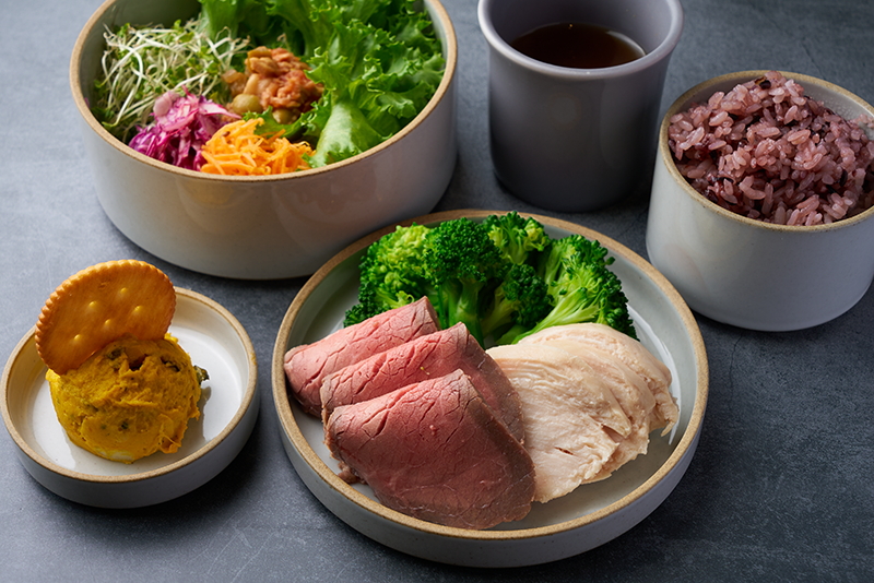 1日じっくり塩漬けし、低温調理で仕上げた豪州黒牛ローストビーフと備中高原鶏チキンブレストのこだわりのタンパク質をしっかり摂れるプレートです。