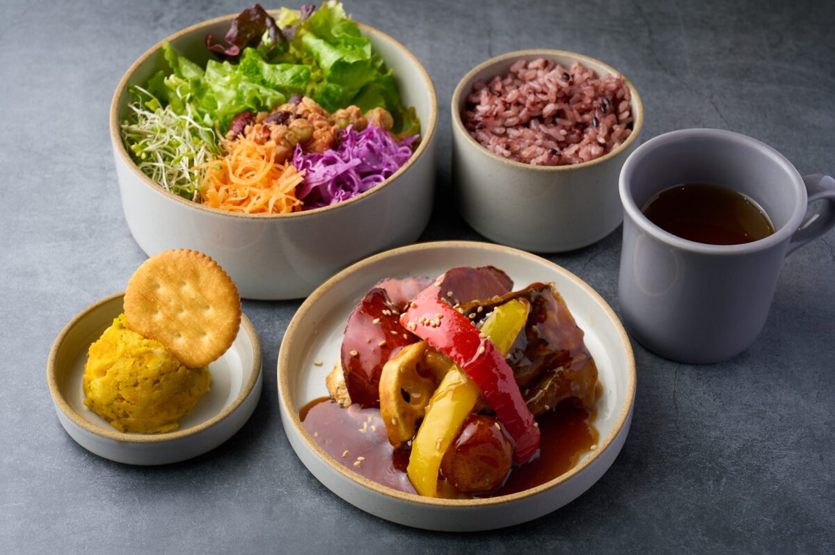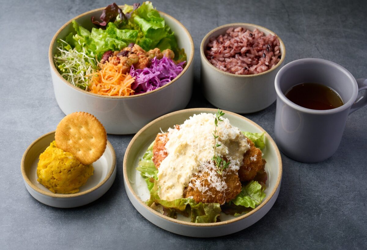 波佐見焼の器に盛られたのはたっぷりの色鮮やかなサラダボウルに、選べるメイン料理(全6種)。黒米ごはん、potto特製の能登のいしる出汁入り味噌汁、お野菜の副菜がついた、カラダにもココロにもうれしいギルトフリーなプレートをお楽しみいただけます。