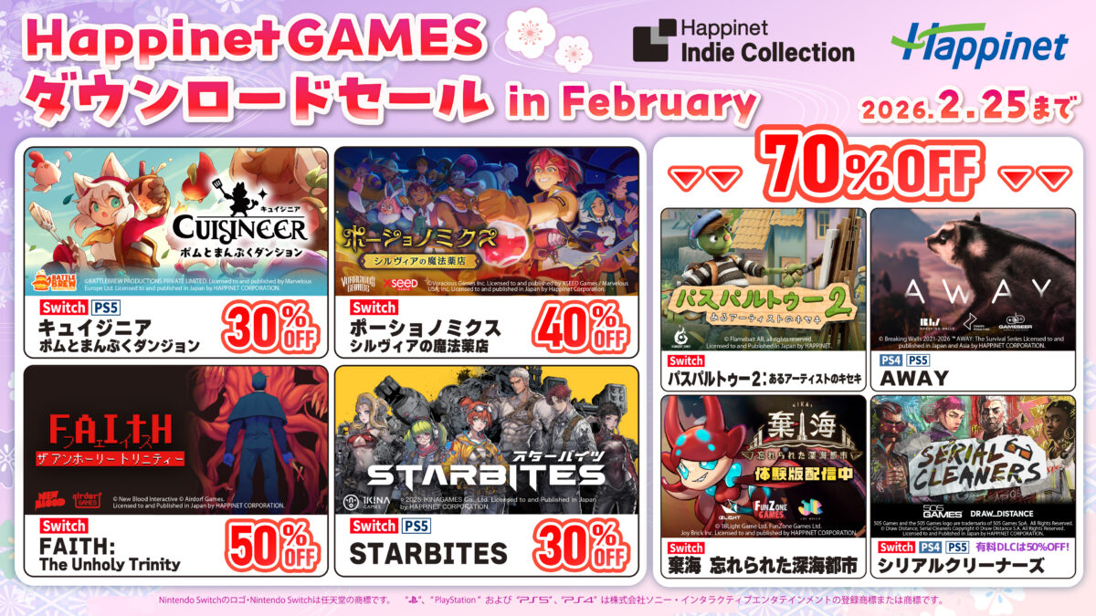 株式会社ハピネット(本社:東京都台東区、代表取締役社長:水谷 敏之、証券コード:7552)は、自社パブリッシングタイトルがお得に購入できる『HappinetGAMES ダウンロードセール in February』を、2026年2月25日(水)まで実施します。