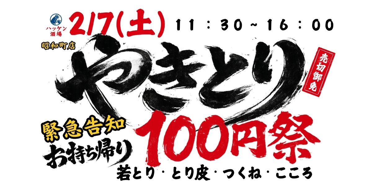 「人・おいしさ・楽しさ」をモットーに地元密着型の居酒屋チェーンを展開するマルシェ株式会社(本社:大阪市阿倍野区、代表取締役社長 加藤 洋嗣)は、日頃のご愛顧に感謝の気持ちを込めて、2026年2月7日(土)11:30より、名物のやきとりをお得に楽しめる1日限定イベント「やきとり100円祭」を開催いたします。地域の皆様への日頃の感謝を込め、店内で丁寧に焼き上げた「若とり」「とり皮」「つくね」「こころ」の4種、合計1,500本をお持ち帰り(限定)、特別価格1本100円(税抜)でご提供いたします。売切れ次第終了の限定イベントとなりますので、ぜひお早めにご利用ください。