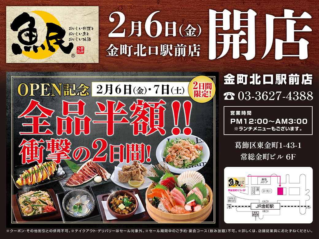 ホームキャンペーン2026年2月6日(金)東京都葛飾区の金町駅前に「魚民 金町北口駅前店」をリニューアルオープン!2日間限定で“全品半額の新店オープン記念セール”を実施!