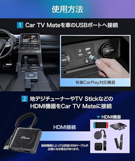 本製品は、純正カーナビに備わっている「有線CarPlay」の通信機能を活用することで、本来は接続できないHDMIデバイスを、車内ディスプレイに映し出すことを可能にします。渋滞中や長距離ドライブ中の車内空間を、映画を楽しめるシアタールームや、白熱した対戦ができるゲームルームへとアップデートします。
