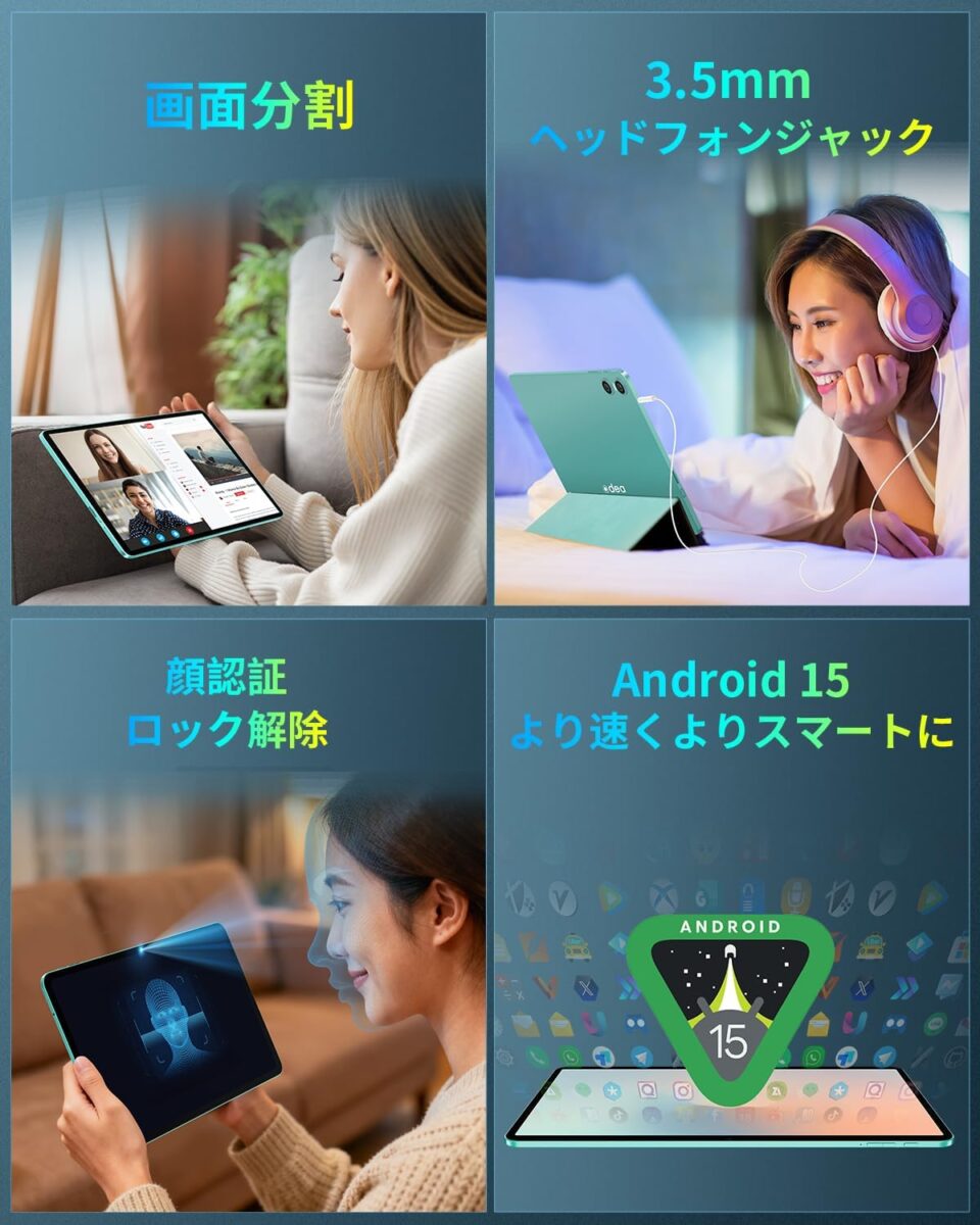 Android 15 タブレットはAndroid タブレット 10インチシステムを搭載し、GMS認証済みでPlayストアや豊富なアプリにアクセス可能です。さらに、アプリのマルチタスクや画面分割機能を活用すれば、動画を見ながらメモを取る、オンライン授業を受けながらブラウザを開くなど、タブレット Androidでの作業効率が格段にアップします。