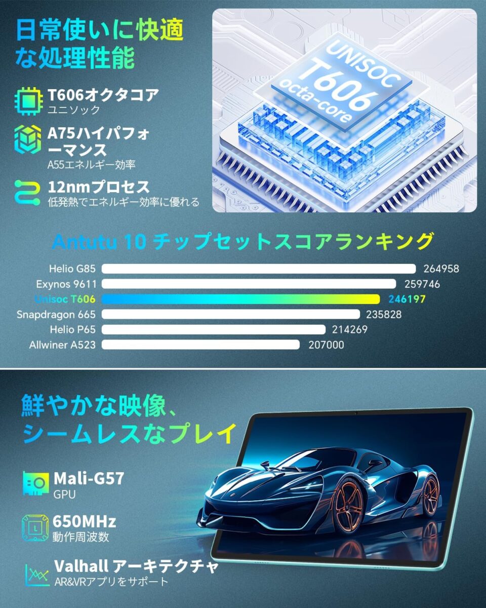 【圧倒的パフォーマンス:高性能 8 コア CPU T606 + 128GB UFS ROM + 12GB RAM + 1TB 拡張】 タブレット 10インチ wi-fiモデルは最大周波数1.6GHzの8コアCPU T606とマルチコアGPU Mali-G57 MP1を搭載し、タブレット Androidでのゲームや動画、ネットサーフィンも快適です。