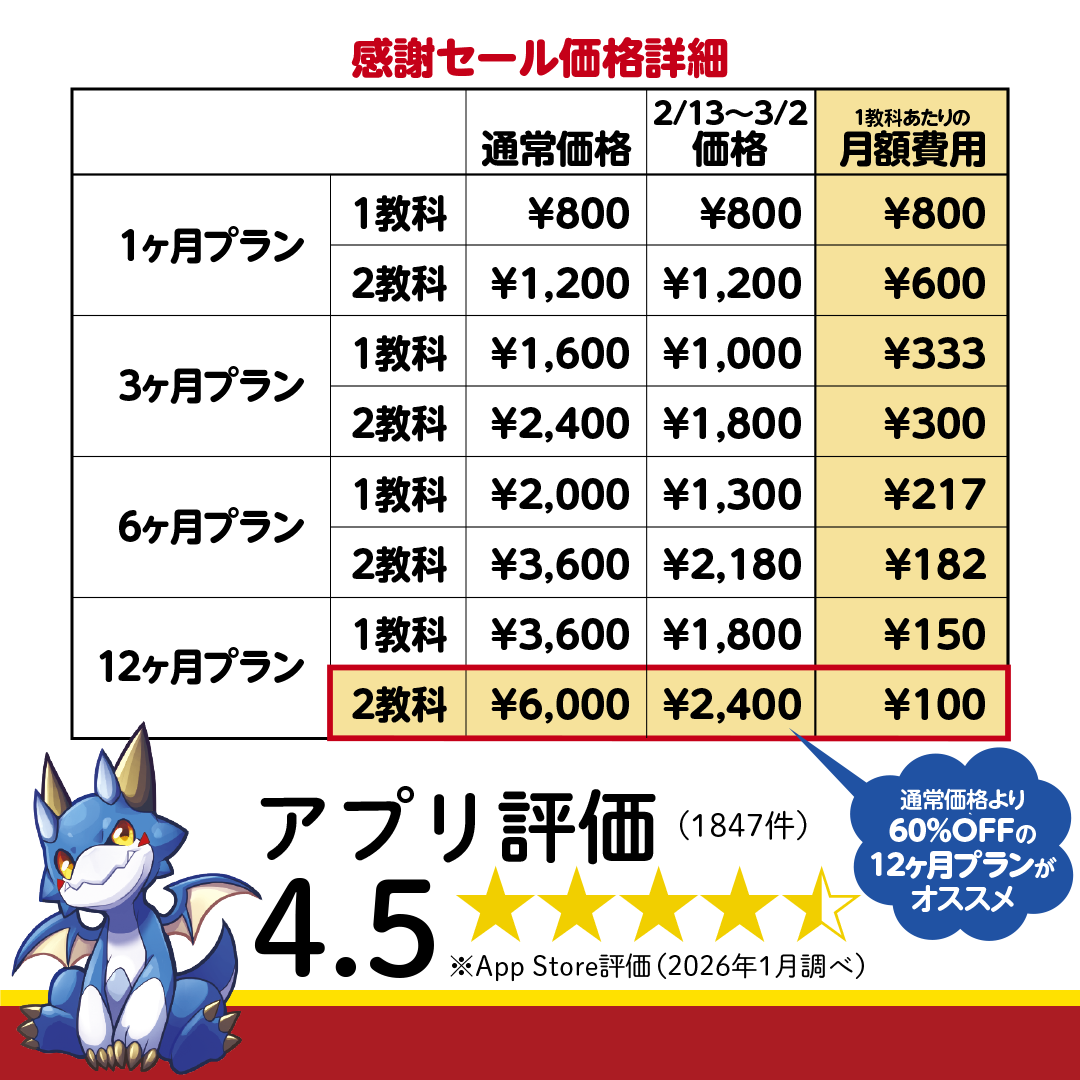 2~3月は新学年のスタートに向けて、総復習&先取り学習をする絶好のチャンス! このアプリ1つで、小学1~4年生の算数と、小学1~4年生の国語の学習が可能です。お得なこの機会に、ぜひご活用ください。