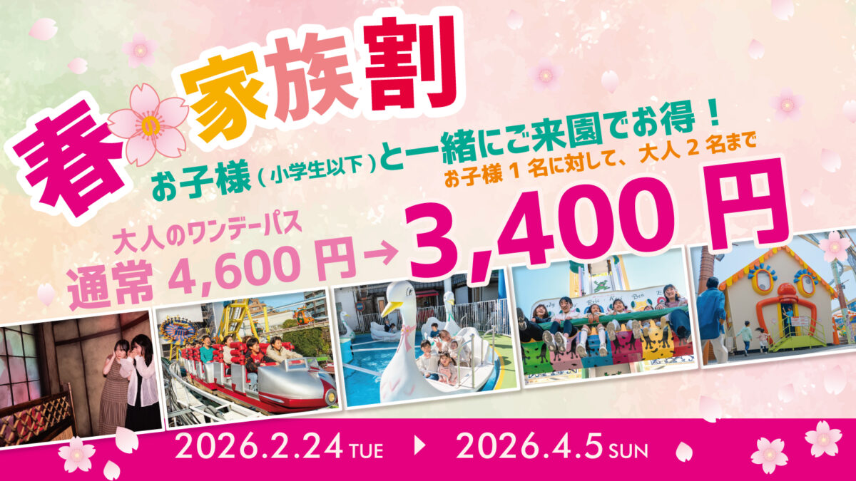 「春の家族割」は、小学生以下のお子様1名につき、大人2名までワンデーパスが割引になるチケットです。お子様と一緒の来園で、パパやママ、おじいちゃんおばあちゃんなど、大人の家族もおトクに花やしきをお楽しみいただけます。