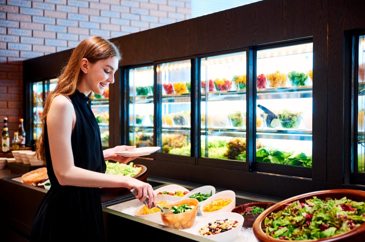 大阪ベイエリアが一望できる開放感たっぷりのテラスで人気の朝食ブッフェを。朝からしっかり食べて、健康的に過ごしていただきたいという思いを込めて約100種類の和洋メニューを豪華にラインナップ。多彩なアレンジが楽しめるサラダバーや海鮮丼をはじめ、目の前で仕上げるステーキなどの“ライブメニュー”、串カツ・黒門市場の漬物などの大阪名物も取り揃えております。リーベルホテルの朝食で気持ちのいい朝のスタートをお迎えください。