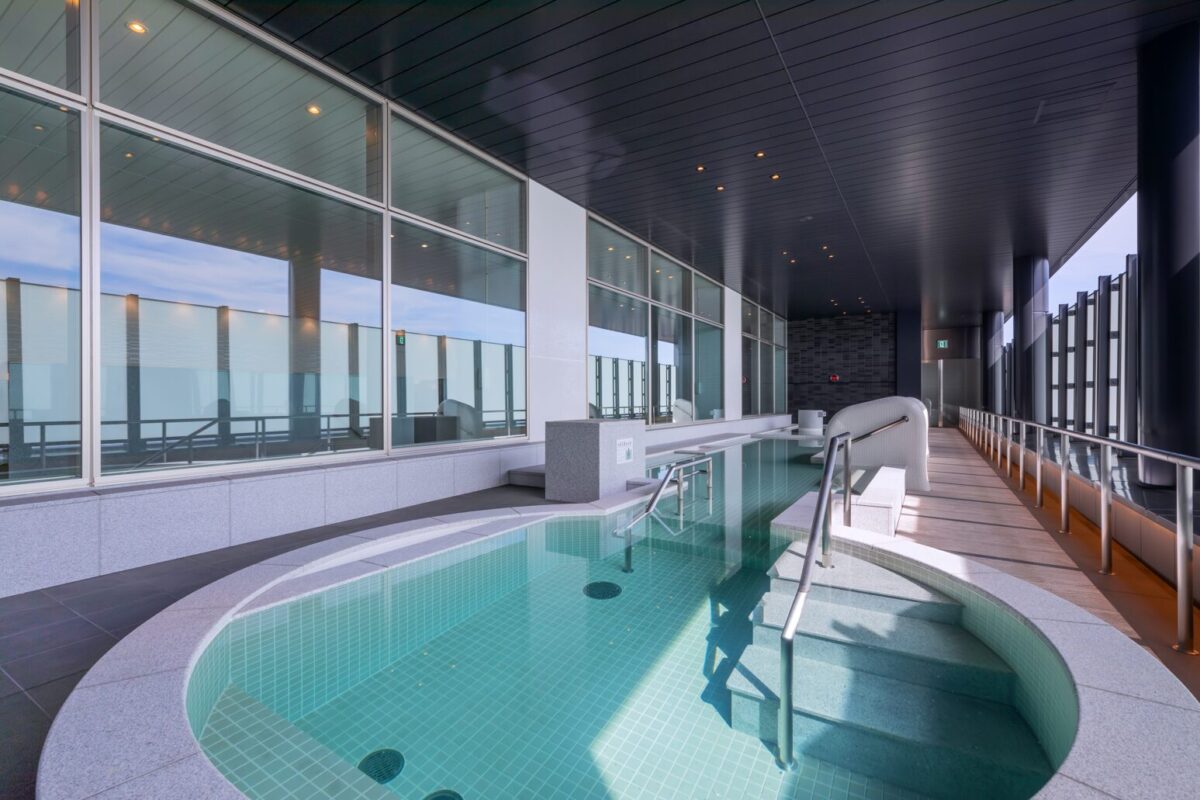 多くの方が広々と入れるスパは、地下約1,000mからくみ上げた天然温泉を贅沢に使用。