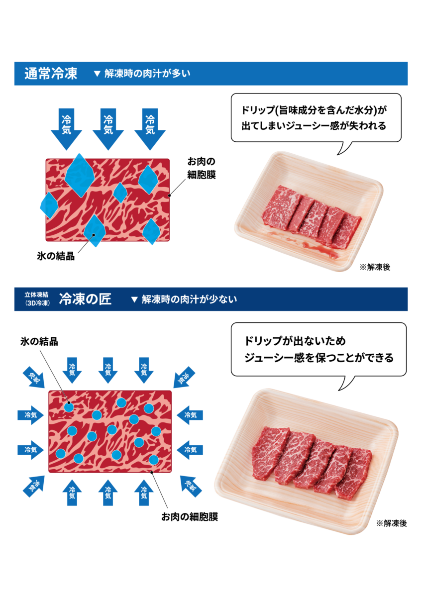 「3Dフリーザーで立体凍結(3D冷凍)させたお肉は、解凍時のドリップが少なく、凍らせる前と同等のおいしさ!」
