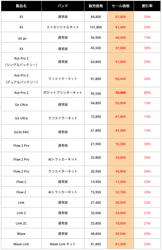 本セールでは、最新の360度全景カメラ「X5」シリーズをはじめ、コンパクトながら高画質を実現する「GO Ultra」、8K対応アクションカメラ「Ace Pro 2」、スマートフォン用ジンバル「Flow 2 Pro」、Webカメラ「Link」シリーズなど、人気製品を最大30%オフの特別価格でご提供いたします。