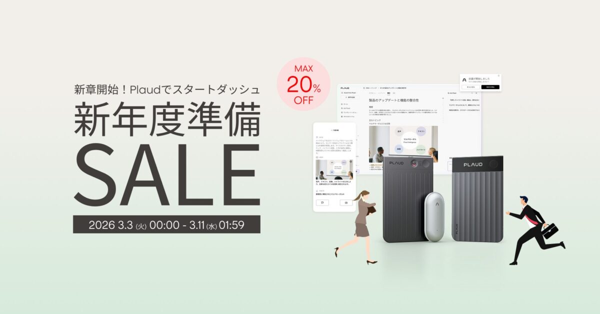 AI議事録ソリューションを展開するPlaud(プラウド、本社:米国カリフォルニア州)は、2026年3月3日(火)より開催される「Amazon 新生活セール(先行セール対象)」に参加いたします。あわせて、公式サイトにて「新年度準備セール」を同時開催いたします。